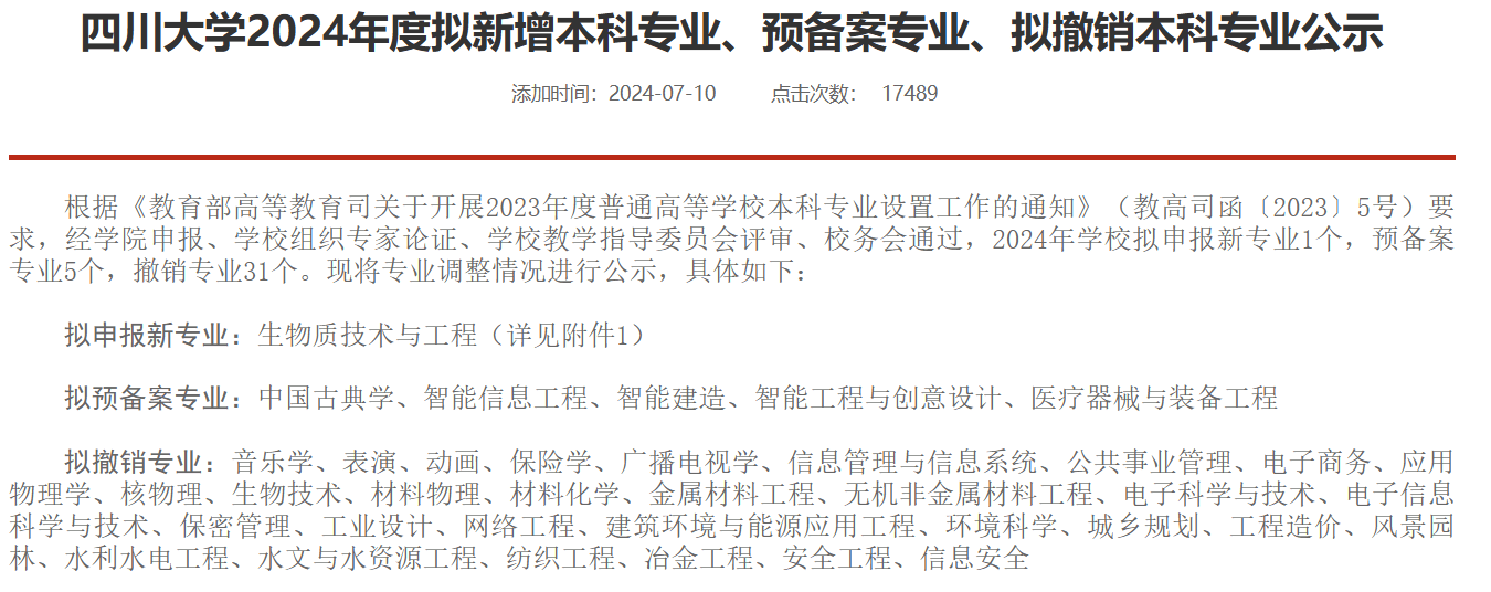 近日,四川大學(xué)公示了2024年擬撤銷的31個(gè)本科專業(yè)計(jì)劃,此舉迅速成為社會(huì)各界關(guān)注的焦點(diǎn)。這些撤銷的專業(yè)橫跨音樂(lè)、藝術(shù)、科技、管理等多個(gè)領(lǐng)域,如音樂(lè)學(xué)、表演、動(dòng)畫及保險(xiǎn)學(xué)等。