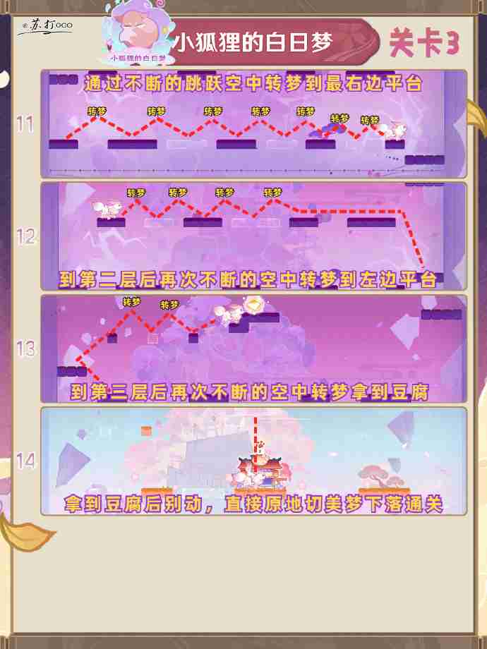 第一場景: 切換至黑夜模式,引誘貓頭鷹出現。切換至白天模式,利用空隙吃到最里面的油豆腐。 記住在吃油豆腐的過程中要靈活切換白天黑夜模式,最后利用白天模式下貓頭鷹的位置到達終點。第二場景: 利用夜晚模式,將貓頭鷹移動到合適位置。切換至白天模式,踩到貓頭鷹頭上,連續跳躍三次吃到油豆腐。 將貓頭鷹移動到不影響你的位置,從最里面的小路跳躍,借助白天模式下的松鼠到達終點。(收集月牙機關需在黑夜模式下進行)第三場景: 建議在跳躍的瞬間切換模式,掌握好節奏。記得吃到頂部的油豆腐后,即可從左邊路線完成通關。