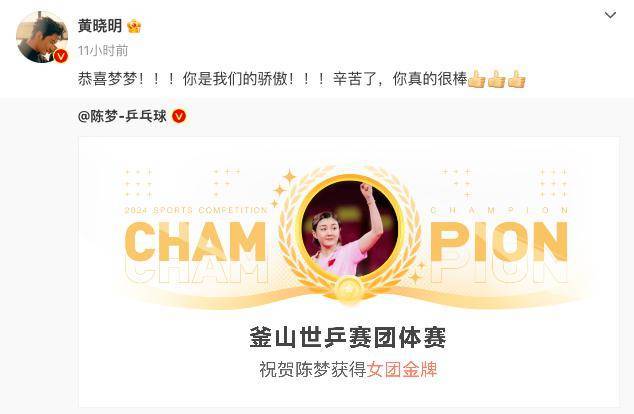 賽后,黃曉明轉發表妹陳夢的奪冠微博并表示:“恭喜夢夢!!!你是我們的驕傲!!!辛苦了,你真的很棒”,并連發三個豎大拇指的表情包。
