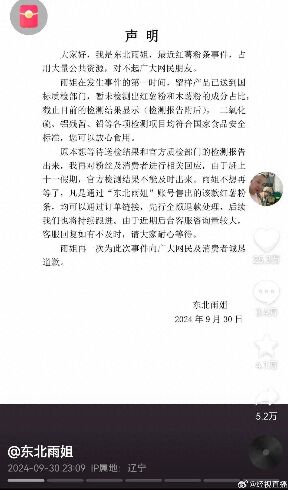 雨姐還在今天的直播中再次回應,表示經過雙方研究、協商,所以就決定白天來拍攝。東北雨姐也承認盤錦河蟹是放到稻田里的,但自己沒在平臺上掛過螃蟹,櫥窗也沒掛,不是為了賣螃蟹,是為了宣傳家鄉。