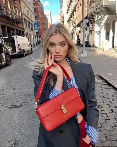 時裝周街拍造型,用紅色小外套搭配藍(lán)色條紋襯衫,撞色搭配更加刺激視覺觀感。