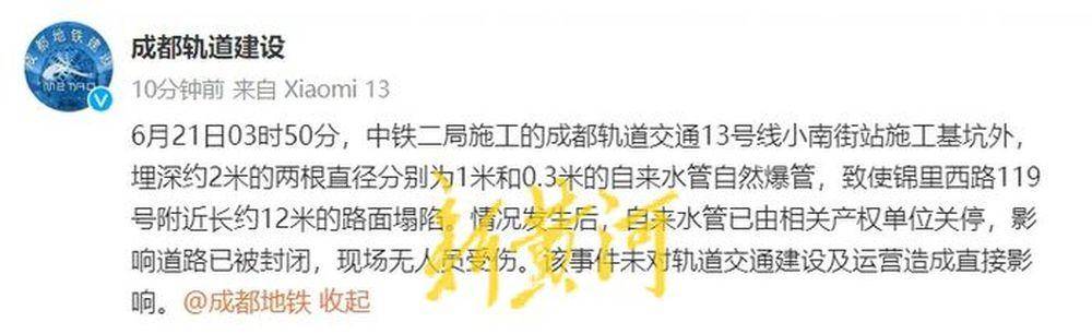 據@成都軌道建設消息,6月21日03時50分,中鐵二局施工的成都軌道交通13號線小南街站施工基坑外,埋深約2米的兩根直徑分別為1米和0.3米的自來水管自然爆管,致使錦里西路119號附近長約12米的路面塌陷。情況發生后,自來水管已由相關產權單位關停,影響道路已被封閉,現場無人員受傷。該事件未對軌道交通建設及運營造成直接影響。