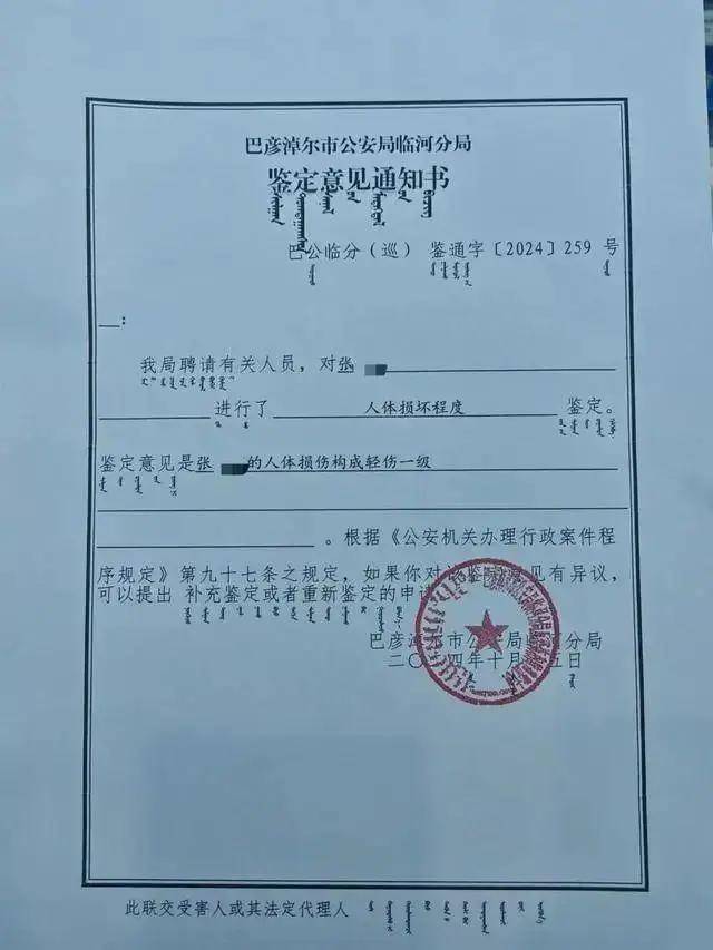 事發后,張女士向警方申請了傷情鑒定。根據10月15日《鑒定意見通知書》顯示,認定張女士構成輕傷一級。
