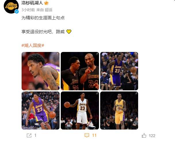 隨后,湖人官方發文稱:“為精彩的生涯畫上句點,享受退役時光吧,路威。”