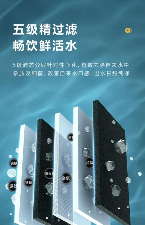 一臺凈水器,最關鍵的就是濾芯,萬家樂“經典白無桶”超濾凈水器的濾芯設計為5級過濾,高達99.9%的細菌除菌率,為健康持續保駕護航。5級過濾分別設置PP棉、椰殼活性炭、超濾膜...每一級濾芯分層都針對性進行水質凈化,層層過濾,有效去除自來水中的微小泥沙、鐵銹、重金屬、余氯及細菌。除了凈化水中肉眼看不見的細菌雜質,還能明顯改善水質口感。讓每一滴“超濾水”都甘甜純凈。在“經典白無桶”的設計中,萬家樂增大了超濾膜面積,這樣不僅過濾效果好,還提升了凈水量。2L/min的出水量,可以讓一家人都暢飲無憂。