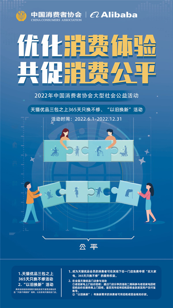 為響應2022年中國消費者協會開展的“優化消費體驗 共促消費公平”大型公益活動,阿里巴巴旗下新零售家電品牌“天貓優品”推出了“買大家電365天只換不修”及“天貓優品以舊換新”兩項重要舉措,更好的解決消費者線下購買大家電存在的維修難和維修價格不透明等問題,致力為消費者打造更公平的消費環境,提供更優質的消費體驗。