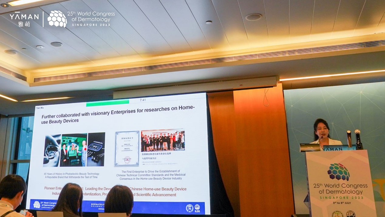 在7月5日舉辦的聚焦家用美容儀研究和應用探討的衛星會上,北京大學第一醫院皮膚科吳艷教授做了“皮膚科醫生眼中的家用美容儀”的主題分享,以雅萌過去幾年在中國市場的醫研共創研究成果為案例與現場來自全球180多個國家的上萬名皮膚學權威專家、醫師代表共同交流家用美容儀與皮膚學的關系,對皮膚學的價值和意義;雅萌首席技術官前田一憲也分享了雅萌家用美容儀技術革新與醫研成果,并與專家們交流了雅萌基于皮膚學的基礎研究,研發的家用美容儀最新技術成果。